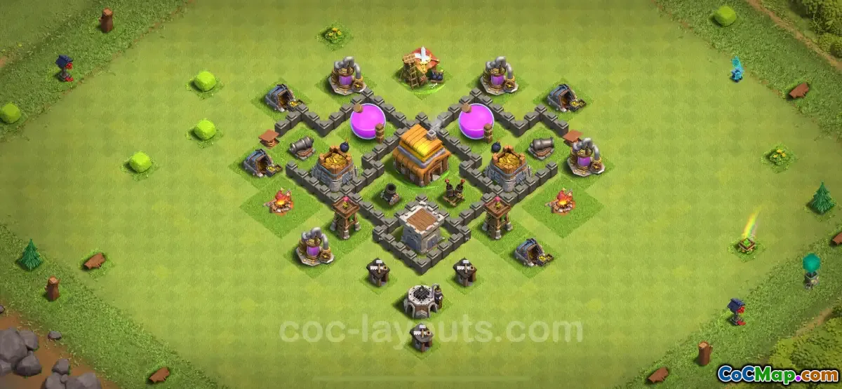 يعد التصميم الأساسي لقاعة المدينة من المستوى 4 (TH4) في Clash of Clans استراتيجية أساسية للاعبين الذين يهدفون إلى تحسين الدفاع عن مواردهم. مع تقدم اللاعبين في اللعبة، يصبح إنشاء تخطيط أساسي قوي أمرًا ضروريًا لحماية مواردهم من الخصوم. تركز قاعدة TH4 على تحقيق التوازن بين الدفاع وإدارة الموارد مع تمكين الزراعة الفعالة للموارد.