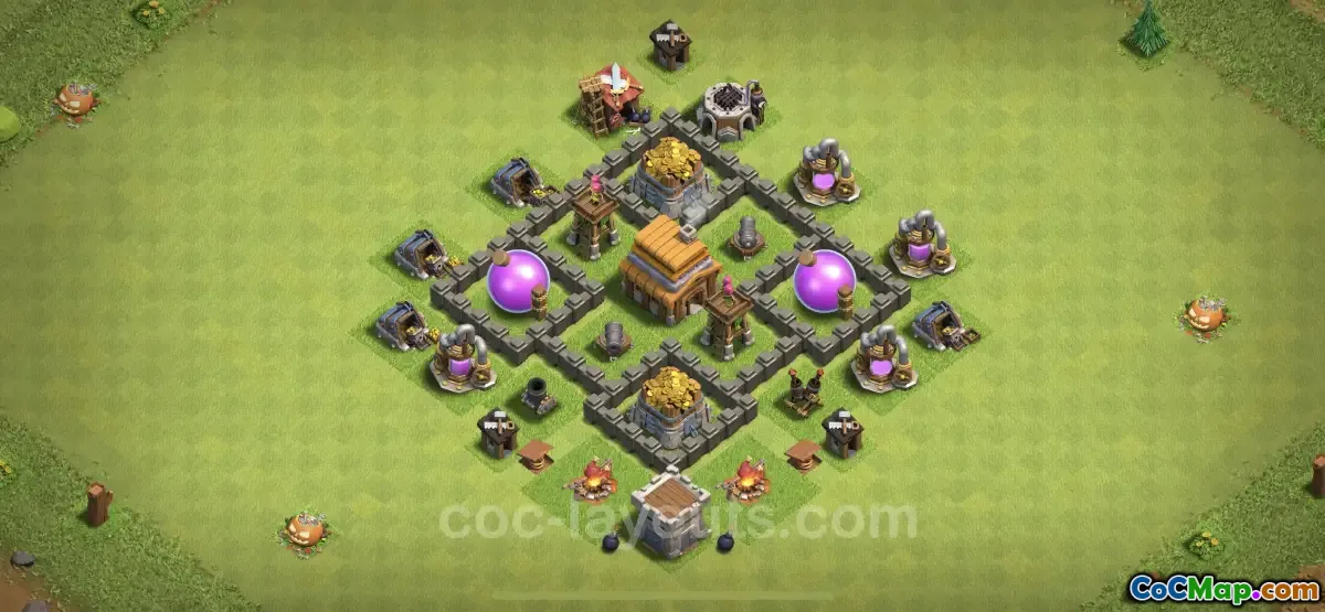 في Clash of Clans، غالبًا ما يصمم اللاعبون قواعدهم لتحسين إدارة الموارد والدفاع، خاصة في مستوى قاعة المدينة 4. يسمح هذا المستوى ببناء هياكل دفاعية متنوعة، والتي تعد ضرورية لحماية الموارد أثناء الزراعة، وهي طريقة لعب شائعة استراتيجية. يمكن للتخطيطات الأساسية الفعالة أن تعزز بشكل كبير قدرة اللاعب على حماية موارده المجمعة ضد هجمات العدو.