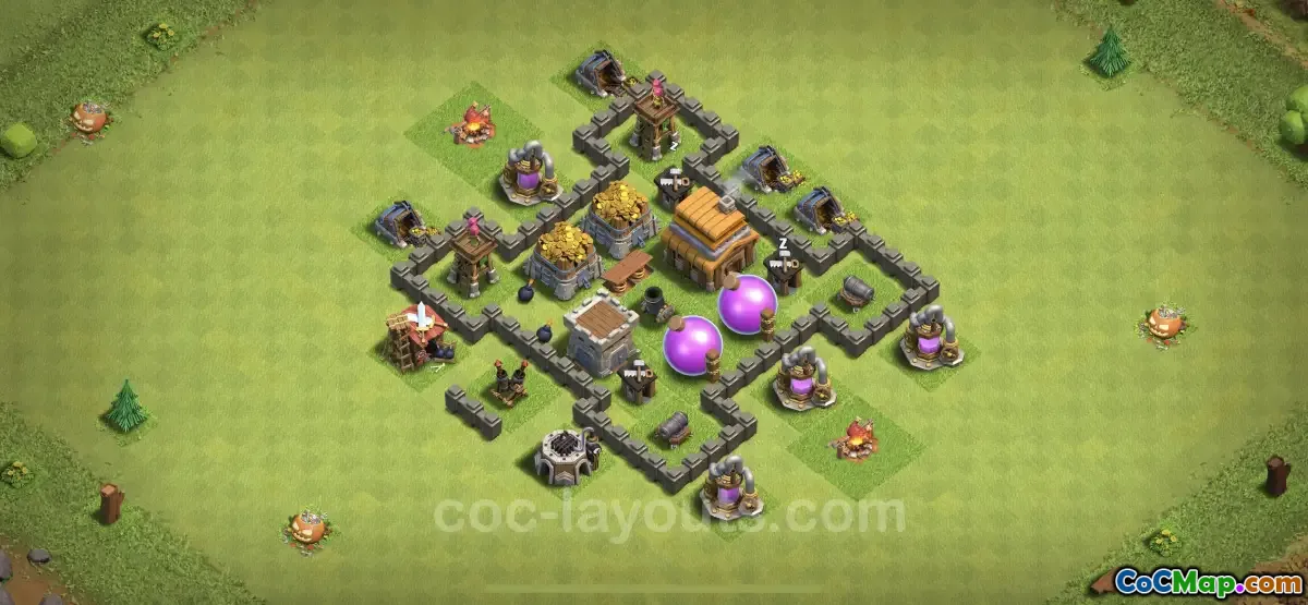 عند تصميم قاعدة لمبنى TH4، يجب على اللاعبين إعطاء الأولوية لوضع الهياكل الدفاعية والمخازن. من الناحية المثالية، يجب وضع المباني الدفاعية مثل المدافع وأبراج الرماة في موقع استراتيجي لتغطية أكبر قدر ممكن من المساحة مع حماية مخازن الموارد من الهجمات القادمة. من المهم وضع هذه الدفاعات بطريقة تمكنها من دعم بعضها البعض، مما يخلق مجالات متداخلة من النار. يمكن للاعبين أيضًا استخدام الجدران لحماية الهياكل المهمة والتحكم في المسار الذي تسلكه قوات العدو أثناء الهجوم.