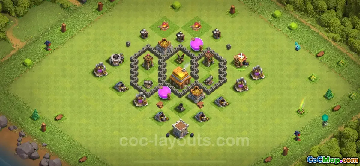 في Clash of Clans، وهي لعبة إستراتيجية شعبية للهواتف المحمولة، غالبًا ما يسعى اللاعبون إلى تحسين تخطيطات قريتهم لتحقيق أقصى قدر من الدفاع عن الموارد. في Town Hall Level 4، يمكن للاعبين تصميم قاعدة تحمي بكفاءة الإكسير والذهب والأصول القيمة الأخرى من المغيرين المحتملين. يمكن أن تساعد القاعدة جيدة التنظيم في ضمان استمرارية هذه الموارد، والتي تعتبر ضرورية لتطوير المباني وتدريب القوات.