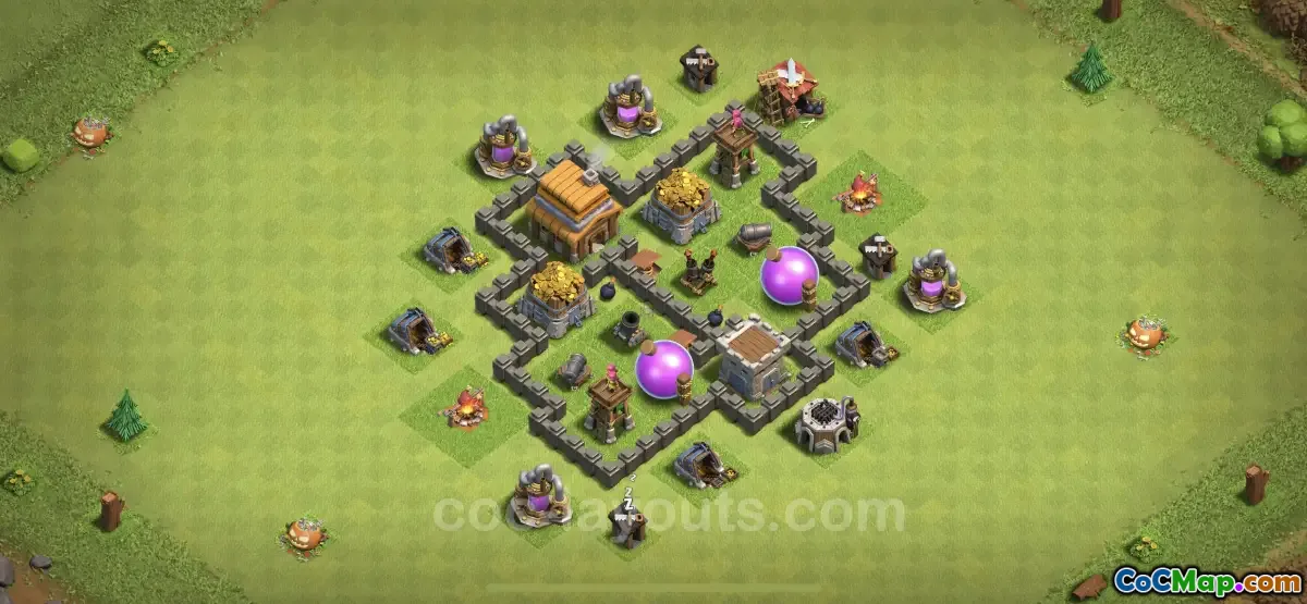 يؤكد تصميم قاعدة TH4 على الموضع الاستراتيجي للمباني والدفاعات لإنشاء تخطيط متوازن. يتم وضع الهياكل الرئيسية مثل Gold Mines وElixir Collectors وStorage بشكل مركزي أو محمية بالجدران لردع المهاجمين. يضمن هذا الترتيب أنه أثناء قيام اللاعب بجمع الموارد، يظل من الصعب على الخصوم الوصول إليها دون تكبد خسائر كبيرة بأنفسهم.