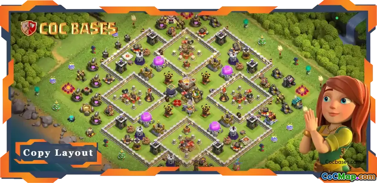 The central feature of this TH11 base is a large compartment that holds four smaller sections within it. These sections are strategically laid out to isolate key defensive structures and make it harder for attackers to plan their strategies. This design not only protects the Town Hall but also ensures that valuable resources and troop upgrades are fortified against enemy raids.
