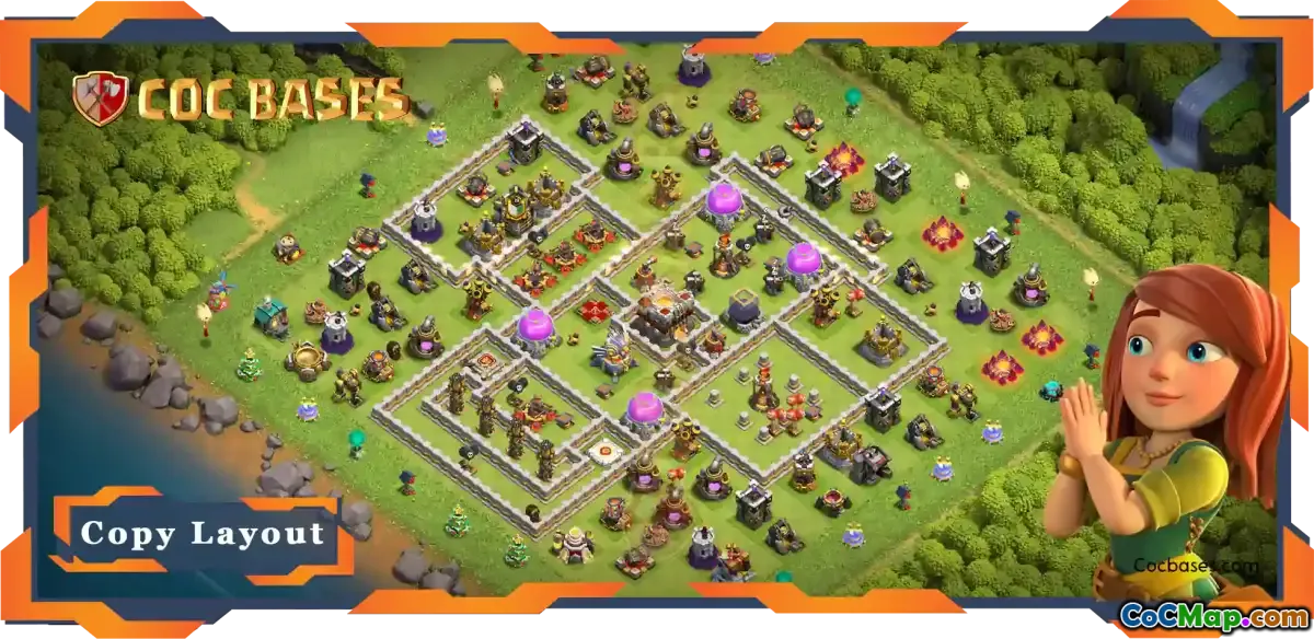 بشكل عام، يمثل تصميم قاعدة TH11 هذا أسلوبًا مدروسًا للتخطيطات المختلطة، مما يضمن الدفاع الجيد عن قاعة المدينة والموارد. من خلال الأخذ في الاعتبار بنية التخطيط والاستخدام الاستراتيجي للجدران والمباني الدفاعية، يمكن للاعبين إنشاء قاعدة هائلة تصمد أمام التحديات التي يواجهونها في اللعبة. وهذا يجعله خيارًا جذابًا للاعبين الذين يتطلعون إلى تحسين استراتيجياتهم الزراعية مع تأمين قاعة المدينة الخاصة بهم بشكل فعال.