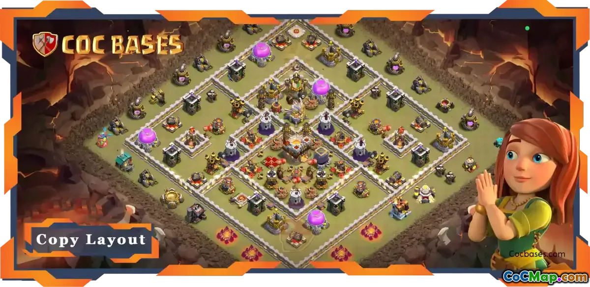 Discover the ultimate TH11 war base layout! Enhanced anti-air defenses, central Town Hall, strategic traps, and more for Clash of Clans. Build and defend!