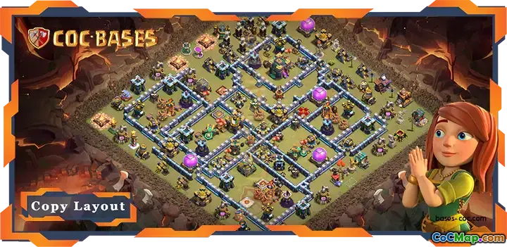تم تصميم قاعدة الحرب هذه، المخصصة لقاعة المدينة من المستوى 14، بشكل استراتيجي لمواجهة استراتيجيات الهجوم المختلفة، مما يجعلها فعالة ضد محاولات النجمتين بالإضافة إلى الهجمات الأكثر قوة أثناء الحروب ودوريات حروب العشائر (CWL). تم تصميم التصميم خصيصًا لحماية قاعة المدينة والدفاعات المحيطة بها، مما يضمن مواجهة المهاجمين لتحديات كبيرة عند محاولتهم تأمين النجوم من هذه القاعدة.