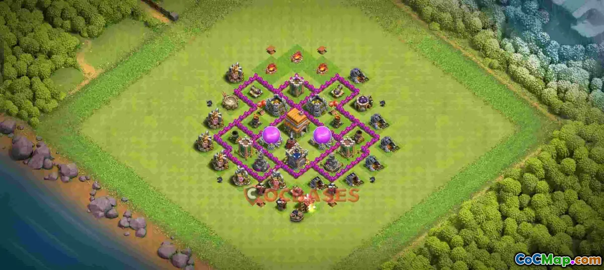 Strategic TH6 farming base layout designed for anti-2 and 3 stars with robust defenses for various attack types, including air and ground units.