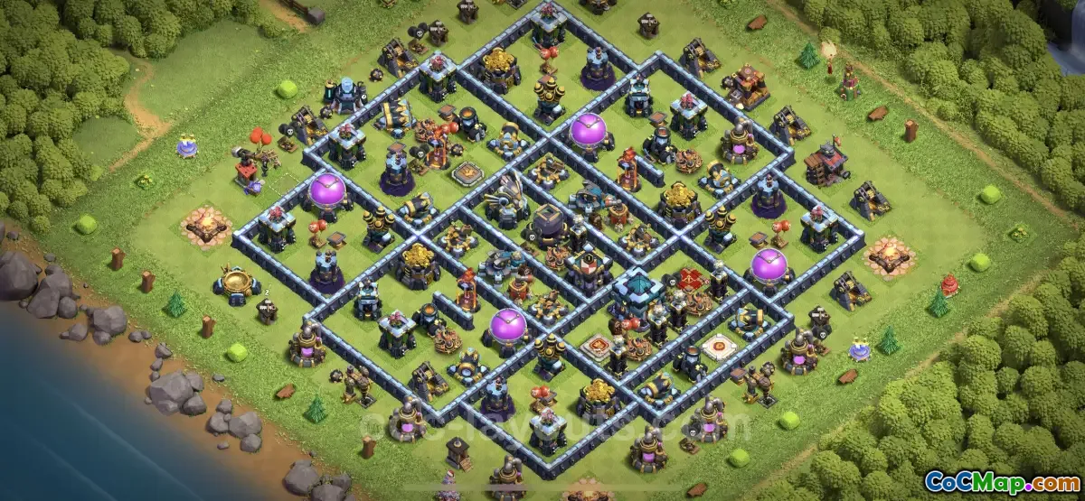 In Clash of Clans, players at Town Hall Level 13 are constantly looking for effective base designs to protect their resources and trophies, particularly from three-star attacks. A well-structured base can significantly enhance a player's defensive capabilities, especially in hybrid setups that balance both defense and resource protection. The primary goal is to create a layout that complicates the attack path for opponents, thus making it harder for them to achieve a three-star victory.