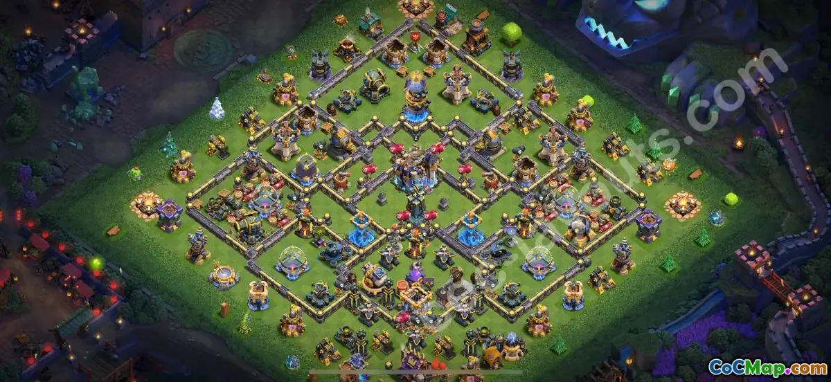Designed with anti-everything principles, this base combines strong defenses, optimized trap placements, and layered walls to frustrate enemy troops and prevent critical structures from falling easily. It’s an ideal choice for players seeking a resilient and reliable defense. The layout also includes a user-friendly copy link, allowing quick setup in your game without hassle, ensuring maximum protection for your Town Hall 18 in Clash of Clans 2025.