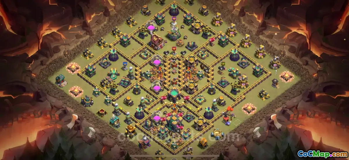 This top War TH14 base is recognized for its anti-everything capabilities, which means it is built to counter different types of units and attack strategies that players might deploy. The design includes a mix of defensive buildings such as archer towers, cannons, and inferno towers. Additionally, traps are well-placed to catch attackers off guard, leading to potential failures in their attacks. The layout is optimized for Clan War, ensuring that opponents will face challenges regardless of their attack composition.