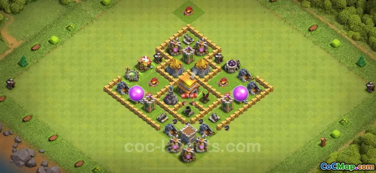 Základní design Town Hall 5 (TH5) v Clash of Clans je vytvořen se zaměřením na silnou obranu, díky čemuž je vysoce účinný proti různým útočným strategiím. Tato základna je označována jako „hybridní“, což znamená, že je postavena tak, aby chránila jak zdroje, tak samotnou radnici. Hráči na této úrovni obvykle potřebují základnu, která odolá útokům pozemních i vzdušných jednotek, a tento design tuto nutnost uspokojuje.