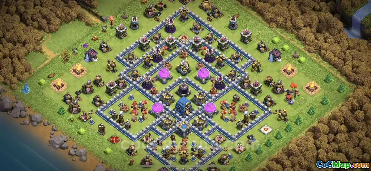 The Farming Base design for Town Hall Level 12 (TH12) in Clash of Clans is specifically engineered to protect resources while deterring three-star attacks. This base layout aims to provide a balanced defense for players who focus on farming resources such as gold, elixir, and dark elixir. By combining elements from various defensive strategies, the TH12 base serves to safeguard valuable resources from attackers who might attempt to completely overrun the base.