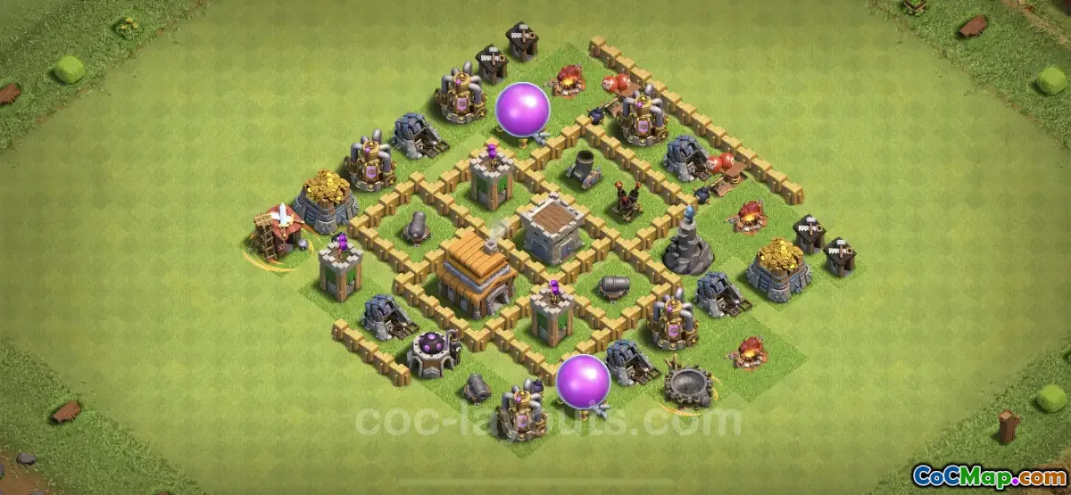 Rozvržení základny TH5 obvykle klade důraz na ochranu radnice, skladů a obranných struktur, které jsou klíčové pro zajištění bezpečnosti trofejí. Takové návrhy často obsahují centralizované umístění klíčových aktiv, což zajišťuje, že se útočníci obtížněji dostávají do důležitých budov. Návrhy základny se navíc mohou lišit v závislosti na tom, zda je primárním cílem obrana zdrojů nebo udržení počtu trofejí.