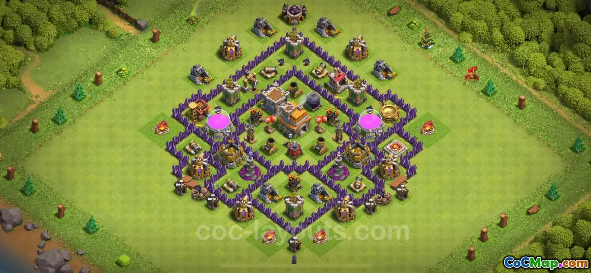 The Trophy Base for Town Hall Level 7 in Clash of Clans is designed specifically for players looking to collect trophies effectively. This base layout provides strategic placements of defenses and structures that maximize the player's ability to fend off attackers while simultaneously accumulating trophies. The organization of buildings and defenses helps in creating a formidable defense that can deter opponents from easily winning battles.