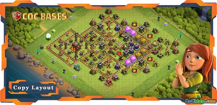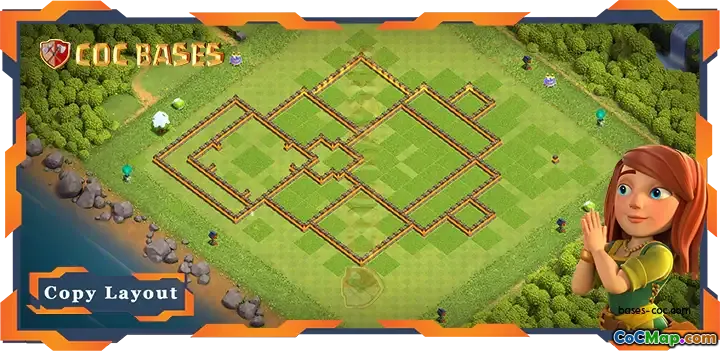 Tato zemědělská základna na úrovni radnice 10 se vyznačuje promyšleným hybridním designem, který maximalizuje ochranu a efektivitu. Jedním z klíčových prvků dispozičního řešení je strategické umístění samotné radnice, která se nachází v pravé části základny. Toto umístění napomáhá nejen k ochraně radnice, ale také zajišťuje opevnění okolních staveb. Návrh rozvržení zahrnuje různé obranné mechanismy k odražení útočníků.