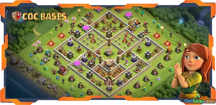 This top TH11 farming base is designed to provide excellent resource protection while maintaining a strategic layout for maximizing defenses. Its hybrid setup balances defensive structures to keep both resources and trophies secure, making it ideal for competitive players seeking steady gains.