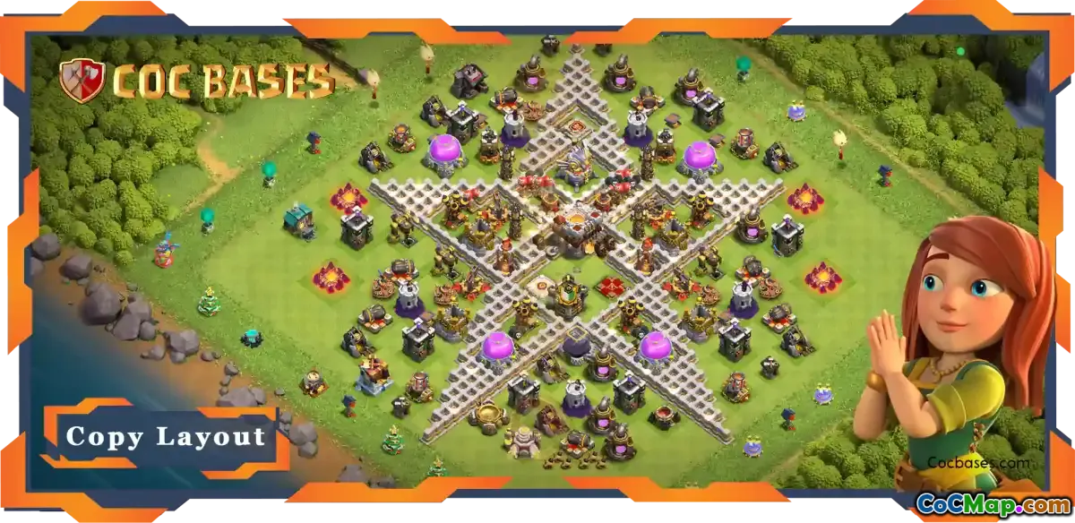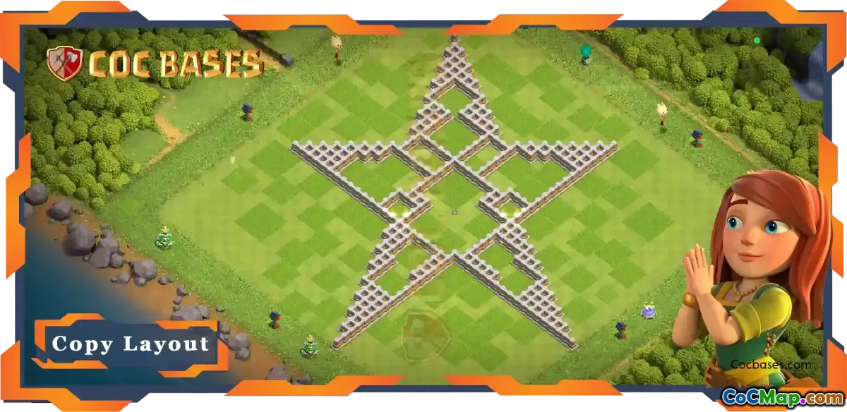 The most distinctive feature of this TH11 troll base is the arrangement of walls that form a large star shape. This design enhances the visual appeal of the base and makes it memorable. Instead of a conventional layout that prioritizes defense, this layout emphasizes fun and a sense of playfulness, reflecting the lighter side of gameplay. The star has six sections, giving it a unique and playful structure that can confuse opponents.