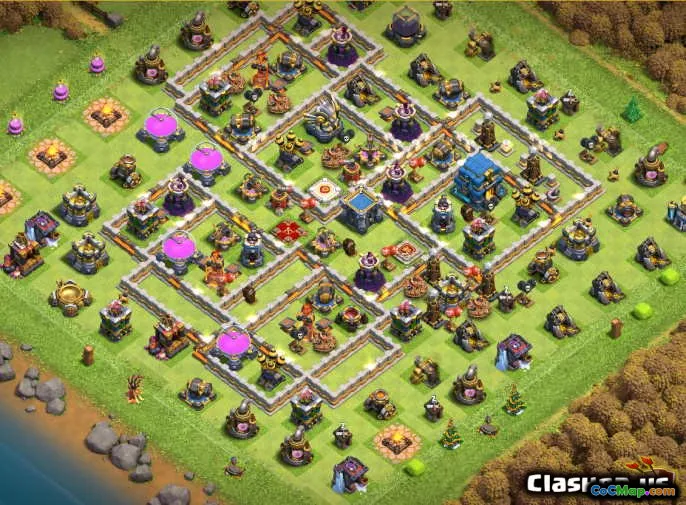 Základní rozložení pro Clash of Clans, konkrétně pro radnici 12, se zaměřuje na vytvoření efektivního a strategického designu pro domácí vesnici, válečnou základnu a trofejní základnu. Na této úrovni musí hráči optimalizovat své rozvržení, aby chránili zdroje a bránili před útoky a zároveň byli schopni provádět úspěšné nájezdy sami. Základna by měla být dobře strukturovaná, s ohledem na umístění defenzivních budov, pastí a skladování zdrojů, aby se maximalizovala jejich účinnost a zajistila udržitelnost ve hře.
