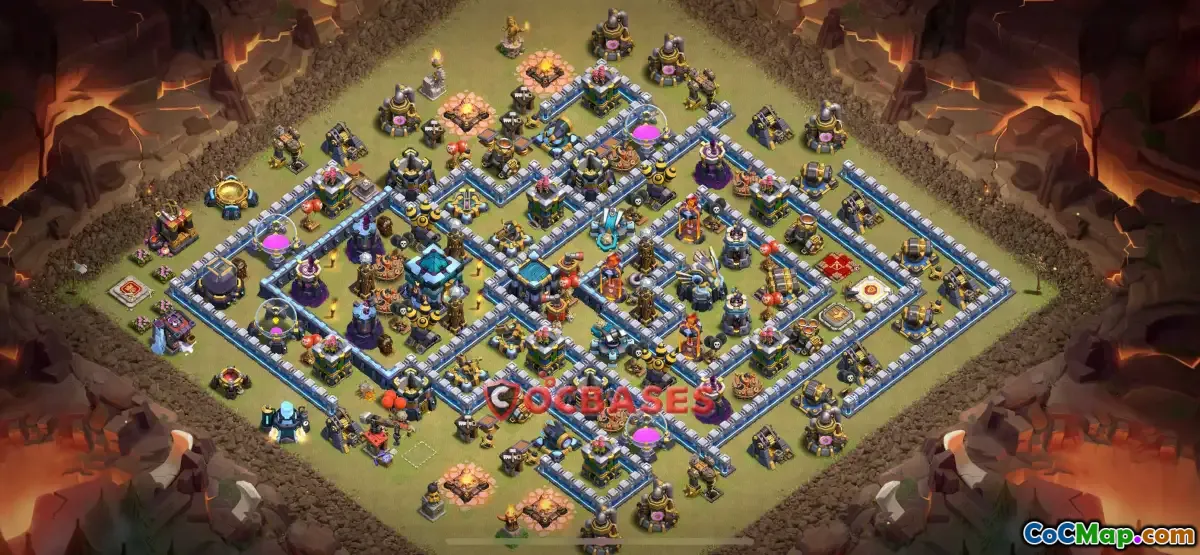 The Town Hall 13 hybrid base in Clash of Clans is designed to be a robust and versatile structure, providing players with a solid defense against three-star attacks. This base layout often features strategic placements of defenses and buildings to effectively protect key resources and the Town Hall itself. The goal of such a base is to make it challenging for opponents to secure a full three-star victory, especially in competitive settings like clan wars and league matches.