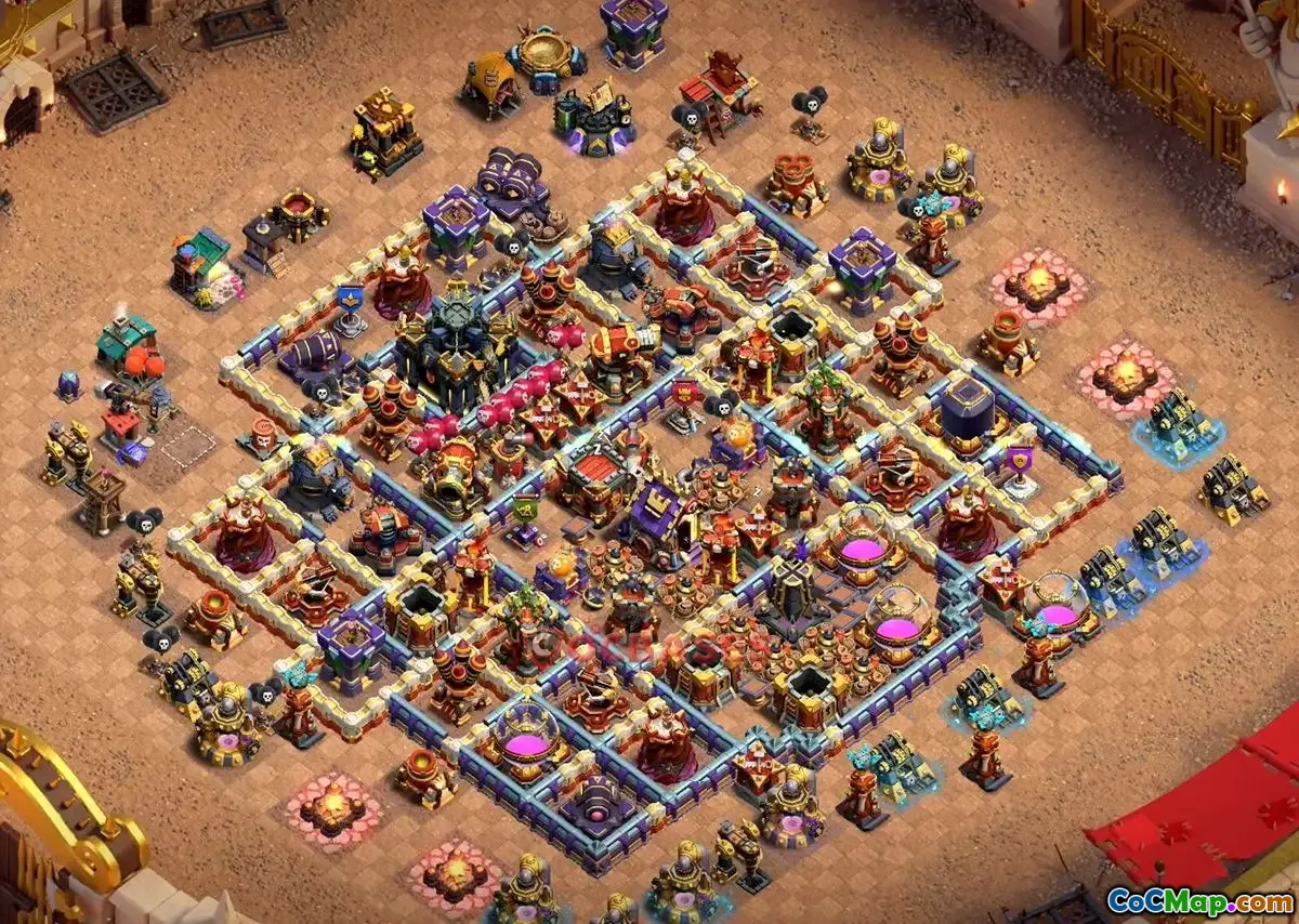 Válečná základna Town Hall 17 ve hře Clash of Clans je speciálně navržena tak, aby pomáhala hráčům bránit jejich zdroje a trofeje během klanových válek. Toto rozvržení základny zohledňuje strategické umístění obranných zařízení, pastí a budov, čímž se optimalizuje šance odolat nepřátelským útokům. Dobře strukturovaná válečná základna může významně ovlivnit výsledek klanových válek, takže je pro hráče nezbytné investovat čas do budování efektivního rozvržení.