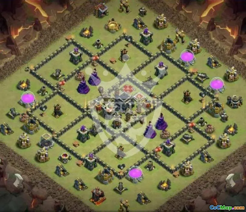 Discover an effective and well-structured Town Hall 9 base layout ideal for protecting your resources and defense objectives. This layout features strategic placement of walls, traps, and defenses to counter common attack strategies, making it perfect for both trophy pushing and clan wars.
