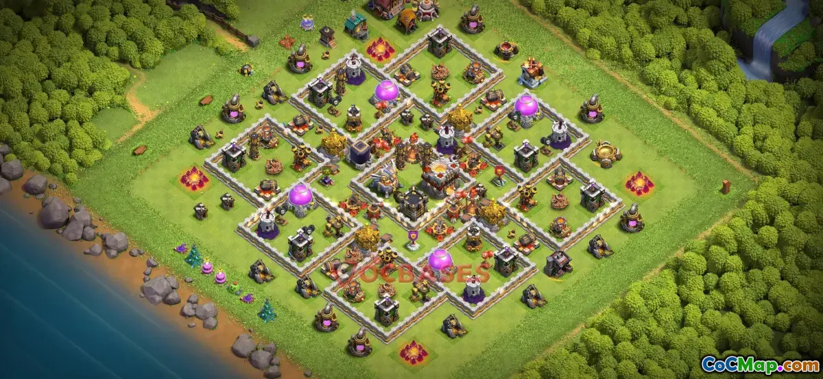 This type of farming base is especially popular among players who want to gather resources efficiently without risking heavy losses. By using specific designs, players can prevent attackers from easily reaching their storages or from earning significant trophies, thus focusing on resource collection rather than ranking up in trophies. Common defenses like multiple Archer Towers, Cannons, and Air Defenses are positioned to cover all angles, making it difficult for attackers to break through.