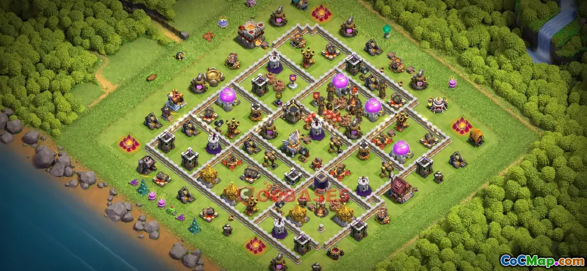 This Town Hall 11 farming base is strategically designed to help players efficiently gather resources while protecting their crucial infrastructure. The layout prioritizes the placement of storage units in well-protected areas, making it difficult for attackers to loot large amounts of resources. The design emphasizes creating a balance between defense structures and resource storage, ensuring that defenses are well-positioned to ward off enemy attacks while still allowing space for resource collection.