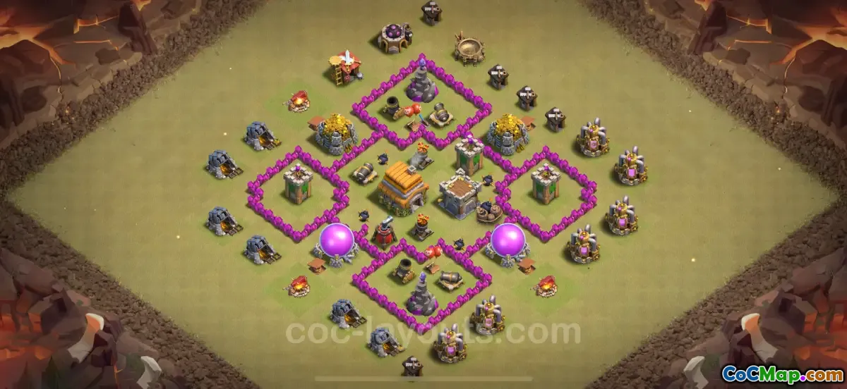 Das Basislayout von Town Hall 6 nutzt die strategische Platzierung von Gebäuden, um eine beeindruckende Verteidigungsstruktur zu schaffen. Wichtige Verteidigungsanlagen wie Kanonen, Bogenschützentürme und Bomben sind so positioniert, dass sie sich gegenseitig abdecken und wichtige Ressourcen sowie das Rathaus selbst schützen. Dieses Design minimiert das Risiko, von feindlichen Truppen überwältigt zu werden, und ist daher unverzichtbar für Spieler, die ihre Leistung in Kriegen und Clan-Herausforderungen verbessern möchten.