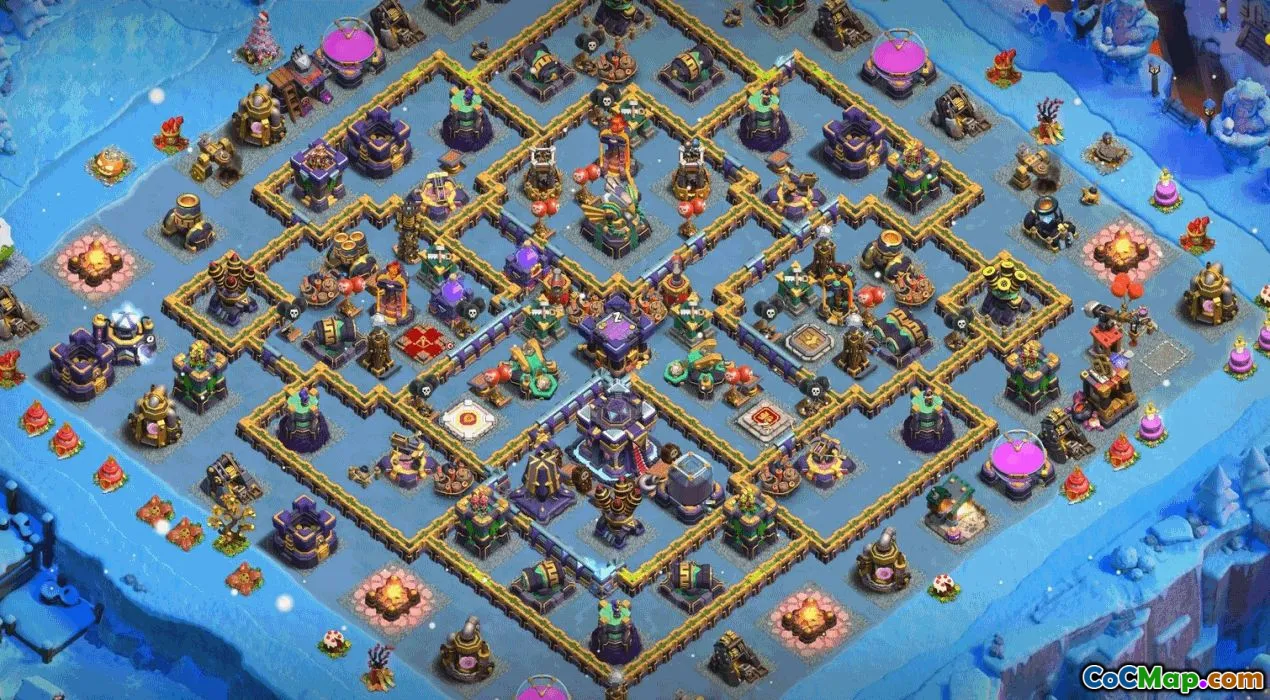 The base layout likely includes linked versions or copies that players can easily access and replicate in their own game. These links facilitate quick reference and implementation of effective defense strategies, ensuring players can optimize their village to protect resources, defend against attacks, and improve their chances during clan wars. The layout may also feature visually appealing designs that are both functional and aesthetically pleasing.