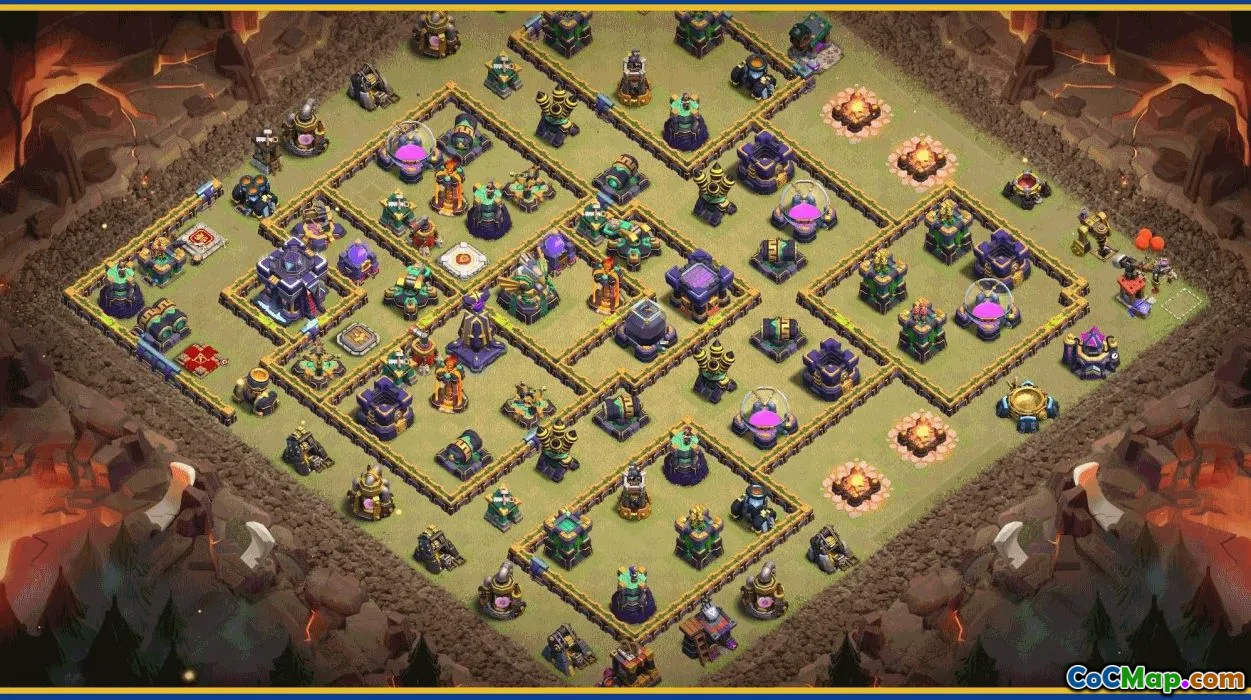 This base layout is designed for Clash of Clans players who are at Town Hall 15, providing an optimized setup for various aspects of the game. It includes a comprehensive map that showcases the primary locations of important buildings and defenses within the village. This layout ensures that players can efficiently defend their resources and protect their Town Hall from enemy attacks, making it ideal for both farming and war scenarios.