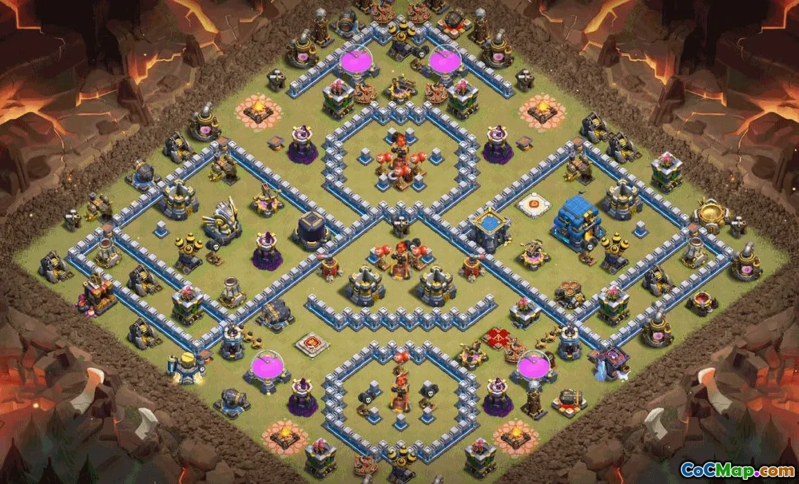 This copyable Town Hall 12 base acts as a flexible template for home village, trophy pushing, war, and hybrid play. The Town Hall sits at the center, protected by a layered ring of defenses and reinforced with well-distributed traps and air defenses. Storages are arranged to distract enemy troops from the core while keeping key resources safe. The layout supports quick reconfiguration without sacrificing balance or protection.