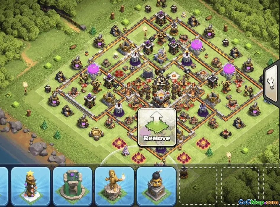 The home village variant focuses on resource safety and a secure Town Hall pocket with layered defenses. Trophy base setups emphasize balanced protection against raiders while maintaining a clean funnel for enemy troops. War base versions center on star protection and smart trap placement to slow opponent armies during clan battles.