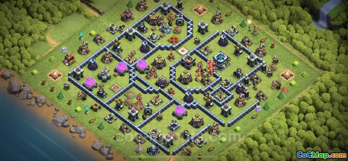This base design not only aims for anti-three-star setups but also offers solid protection against all types of attacks. By including specific features such as traps, walls, and artillery, it enhances the overall defensive capability of the Town Hall 13. The strategic positioning of buildings makes it difficult for attackers to achieve their objectives, forcing them to expend more troops and resources than they might have planned. This means that even if the opponent comes with strong strategies, they will find it challenging to succeed completely against this layout.