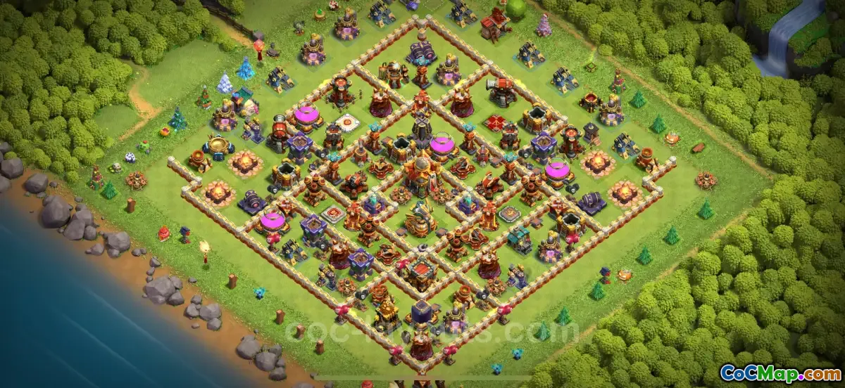 The Farming Base TH16 is designed specifically for players of Clash of Clans looking to protect their resources while minimizing the risk of being three-starred by attackers. This base layout is tailored for Town Hall Level 16, making it suitable for those who have advanced in the game and need a robust defense strategy. The strategic placement of buildings and defenses in this layout helps to keep resources safe from enemy raids, making it vital for players focused on farming efficiently.