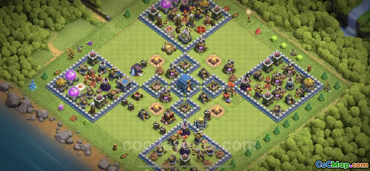 Ultimately, this TH12 base design offers a comprehensive plan for players looking to enhance their farming capabilities while safeguarding their resources. By utilizing such layouts, players can enjoy a more secure gameplay experience, ensuring that they retain their hard-earned resources against a wide variety of attack strategies. This hybrid base not only caters to the immediate needs of farming but also strengthens the overall defensive posture, making it a valuable asset for any TH12 player in Clash of Clans.
