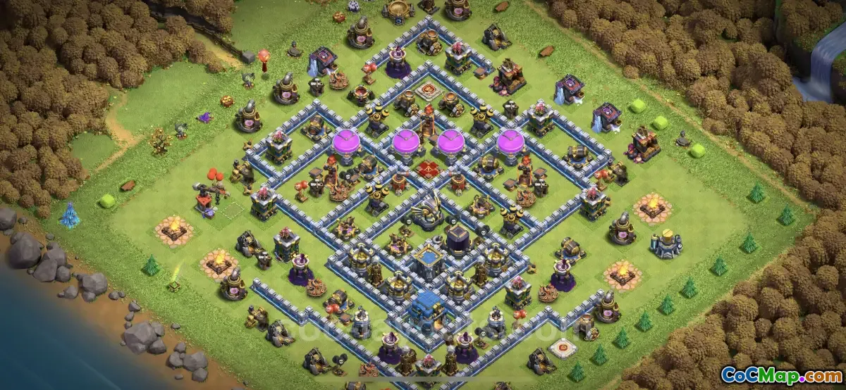 The design’s hybrid nature means that it is versatile enough to withstand both farming attacks and trophy pushes. While focusing on resource defense, it does not compromise on the ability to gain trophies, making it appealing to a wide range of players. This balance is essential for those who wish to engage in both farming and competitive aspects of the game without needing to frequently switch base layouts.