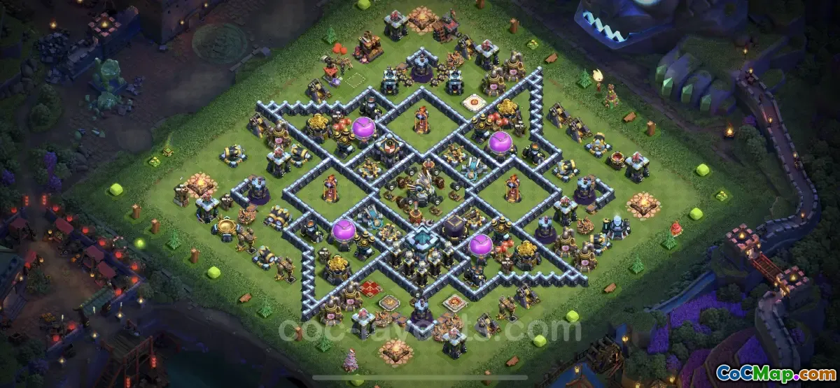 Discover the ultimate TH13 Farming Base with a strong anti-3 star design. Secure your resources in Clash of Clans with our base copy and layout guide!