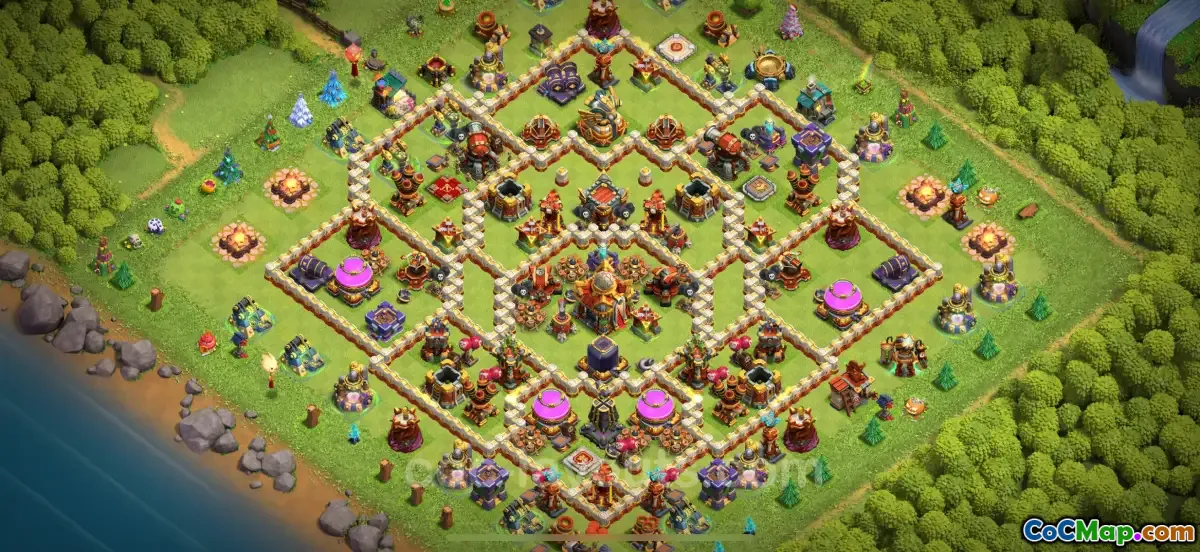 Dieses spezielle Basisdesign bietet einen Hybridaufbau, was bedeutet, dass es sowohl für die Trophäenverteidigung als auch für die Landwirtschaft optimiert ist. Das Layout ist so konzipiert, dass es wertvolle Ressourcen wie Gold, Elixier und dunkles Elixier effektiv abschirmt und es Gegnern erschwert, Ihre hart verdiente Beute zu stehlen. Dies gleicht die Bedürfnisse von Spielern aus, die sich darauf konzentrieren, ihr Rathaus voranzutreiben und ihre Truppen zu verbessern und sich gleichzeitig gegen Überfälle zu verteidigen.