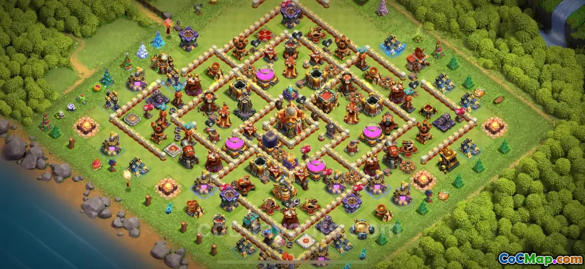 The Farming Base for Town Hall Level 16 in Clash of Clans is designed specifically for resource defense, aiming to minimize the risk of losing valuable resources during attacks. This base layout employs strategic placement of defenses and buildings to create obstacles for attacking opponents, making it difficult for them to achieve a three-star victory. By utilizing this base design, players can protect their elixir, gold, and dark elixir effectively while focusing on farming and resource gathering.