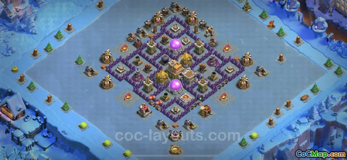 This base design is characterized as "anti 2 stars," which means it is structured to deny opponents the second star in battles. Typically, in Clash of Clans, players can earn up to three stars by destroying key targets within their adversary’s base. By creating defensive strategies that protect critical structures, such as the Town Hall and exposed resource storages, this TH7 base effectively mitigates the potential for attackers to score both one and two stars against it. This feature is particularly beneficial during farming, as it safeguards the resources more efficiently.