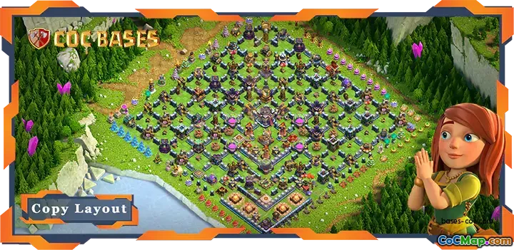 Das beschriebene Layout ist ein einzigartiges Design für eine Town Hall 15 (TH15)-Basis im Spiel Clash of Clans. Dieser Stützpunkt zeichnet sich durch einen humorvollen Ansatz aus, bei dem sowohl Verteidigung als auch Ressourcenschutz im Vordergrund stehen. Das Gesamtdesign nutzt geschickt die Anordnung von Wänden und Gebäuden, um eine netzartige Struktur zu schaffen, die Angreifer verwirren und gleichzeitig strategische Vorteile bieten kann.