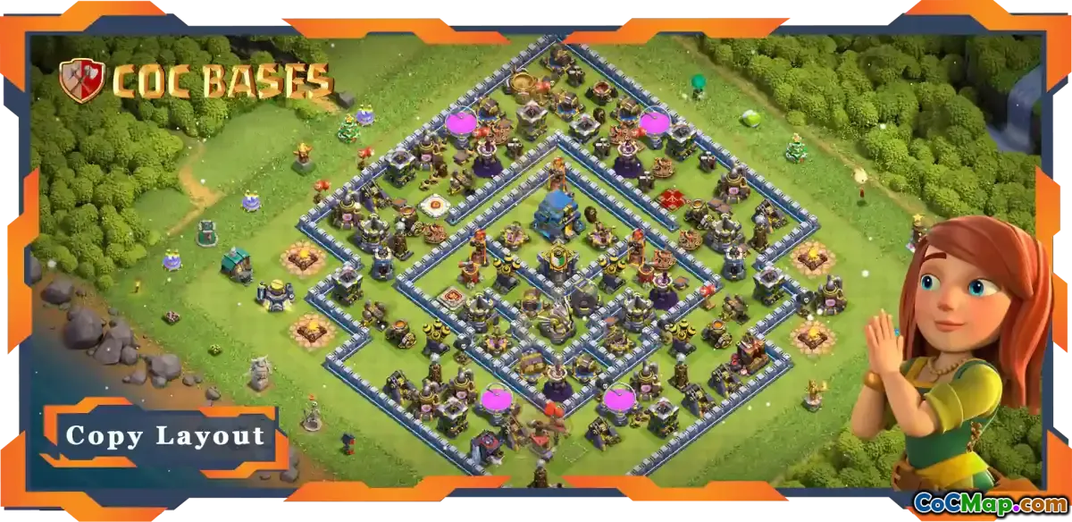 The base layout also considers the placement of traps and defensive units. It includes strategic locations for bombs, spring traps, and seeking air mines to surprise attackers and inflict unexpected damage. Furthermore, defenses like Inferno Towers and Eagle Artillery are thoughtfully positioned to offer both coverage and overlap, ensuring that they can support each other during raids. Layering defenses in this way complicates the attackers’ strategies, making successful raids more challenging.
