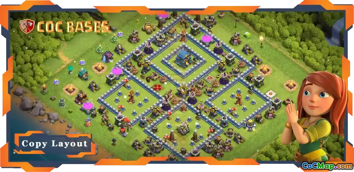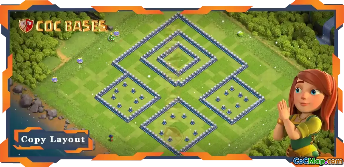 This base features strategic placement of defenses to counter common attack strategies. The layout ensures that key defensive structures like Archer Towers, Cannons, and Inferno Towers are well-guarded. The utilization of walls is critical in this design, creating barriers that slow down enemy troops while making it difficult for them to access the more vulnerable areas of the base.