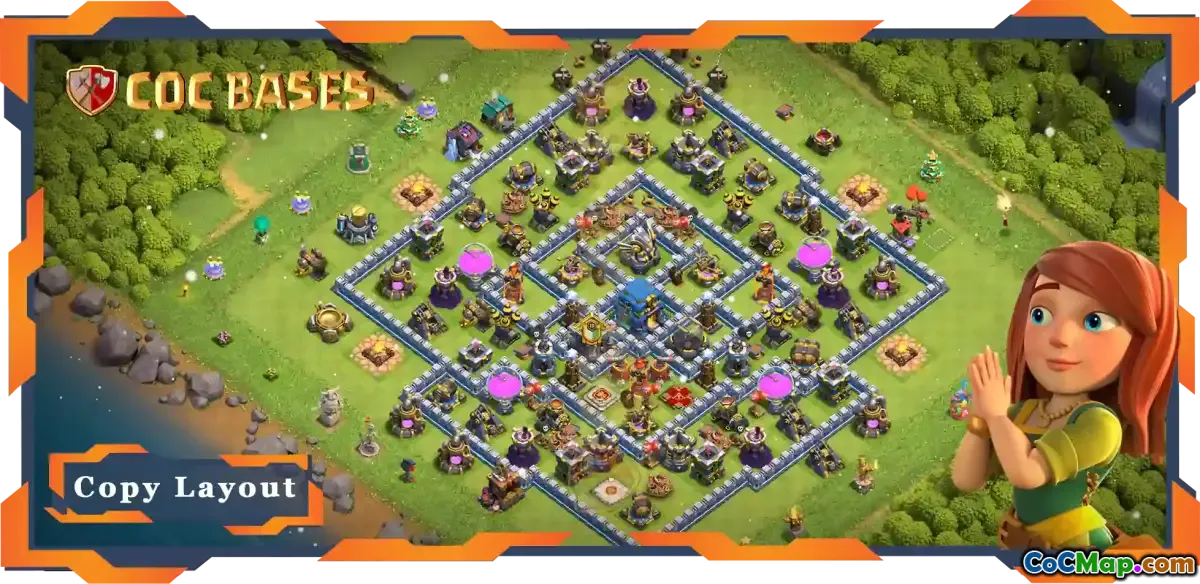 This base layout employs a hybrid strategy, combining elements that focus on defense and efficiency. Key defensive structures such as Inferno Towers, Eagle Artilleries, and X-Bows are strategically positioned to provide maximum coverage and protection against various attack strategies. Additionally, walls are meticulously configured to create compartments that slow down enemy troops, providing an added layer of defense and hindering the attackers' progress.