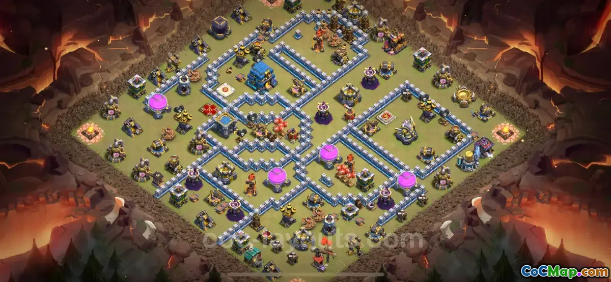 In addition to its anti-air defenses, this war base layout is also well-balanced to handle ground-based troop invasions. While the primary focus may be on defending against air, the design includes several elements that make it less vulnerable to ground troop strategies. This dual approach ensures players can protect their resources and trophies effectively, regardless of the attack method employed by their opponents.