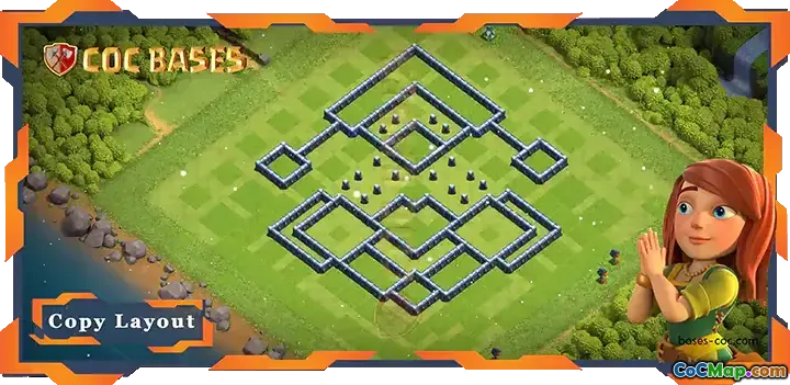 The design divides the base into two main sections, enhancing its defensive capabilities. The first section is further broken down into three distinct portions. This segmentation creates layers of defense, with the Town Hall notably located in one of the corners. The strategic choice of placing it here, surrounded by walls, serves to protect it from direct assaults and encourages attackers to engage with other defensive mechanisms first.