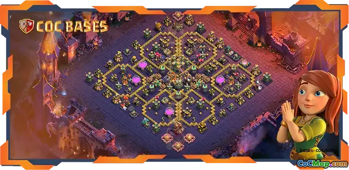 This Top War Base for TH14 is designed with a strong emphasis on Trophy protection and Anti-AirElectro defense strategies. Its hybrid layout efficiently balances resource protection and war attack defense, making it ideal for both defensive play and clan wars.