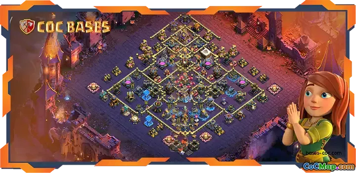 This top-tier TH18 war base layout offers robust protection with strategic placement of defenses, heroes, and traps to prevent opponents from achieving 3-star victories. It features centralized Clan Castle and Eagle Artillery to maximize damage output during enemy assaults, while the perimeter is fortified with well-placed walls and splash damage defenses to slow down attacking troops.