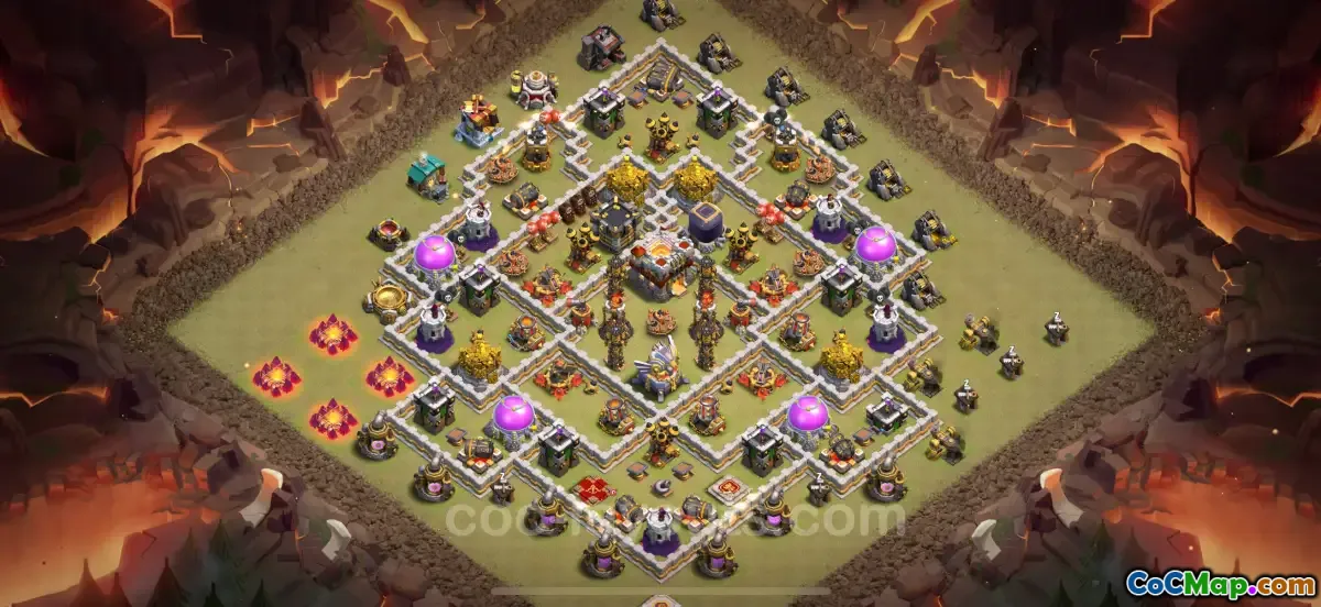 Este diseño de base en particular se caracteriza por su inteligente ubicación de estructuras defensivas, trampas y muros. Al colocar estratégicamente defensas clave como Inferno Towers, Eagle Artilleries y tropas del Clan Castle, los jugadores pueden maximizar la efectividad de su base contra diversas estrategias de ataque. Cada elemento está colocado para desafiar a los atacantes desde diferentes ángulos y obligarlos a adaptarse, lo que a menudo resulta en errores costosos.