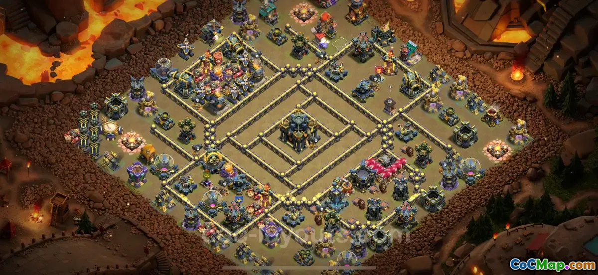 This optimized TH17 war base layout for Clash of Clans 2025 is designed to maximize defense and protect your clan’s resources during Clan War Leagues. It features well-placed defenses, traps, and heroes to create a balanced defense against various attack strategies.