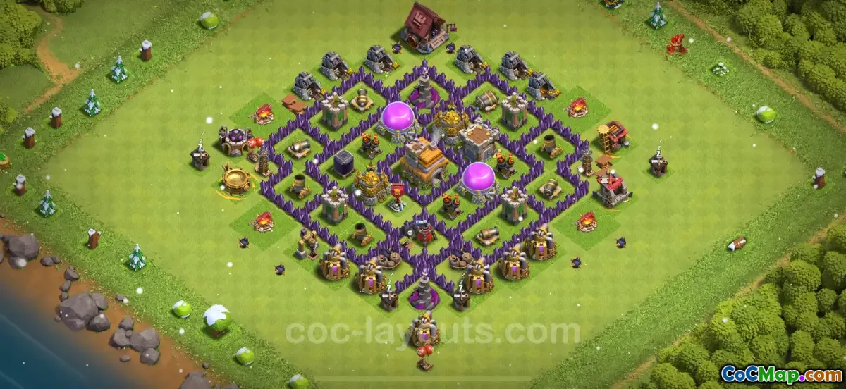 El diseño de la base Top Anti Everything TH7 está cuidadosamente diseñado para alterar los patrones de ataque del enemigo. La ubicación de las defensas, incluidos morteros, cañones y torres de arqueros, es estratégica para maximizar su cobertura. Al colocar estructuras defensivas clave hacia el centro de la base, el diseño crea un núcleo difícil de alcanzar para los atacantes. Esta centralización desalienta el uso de tácticas de tropas comunes, mejorando así las capacidades defensivas generales de la base.